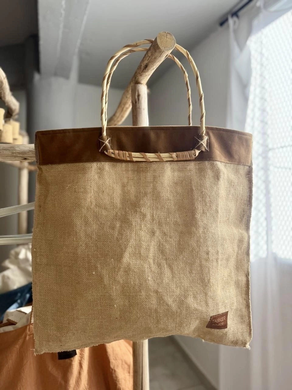 Bolso de arpillera combinado con gamuzón sintetico en la parte superior, forrado en tela de gasa, con bolsillo interno y detalles en hilo de yute. Las manijas son de mimbre rígidas, miden 50 cm libres.