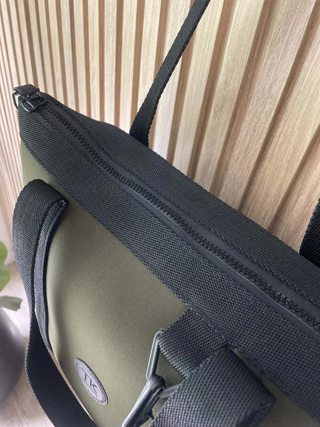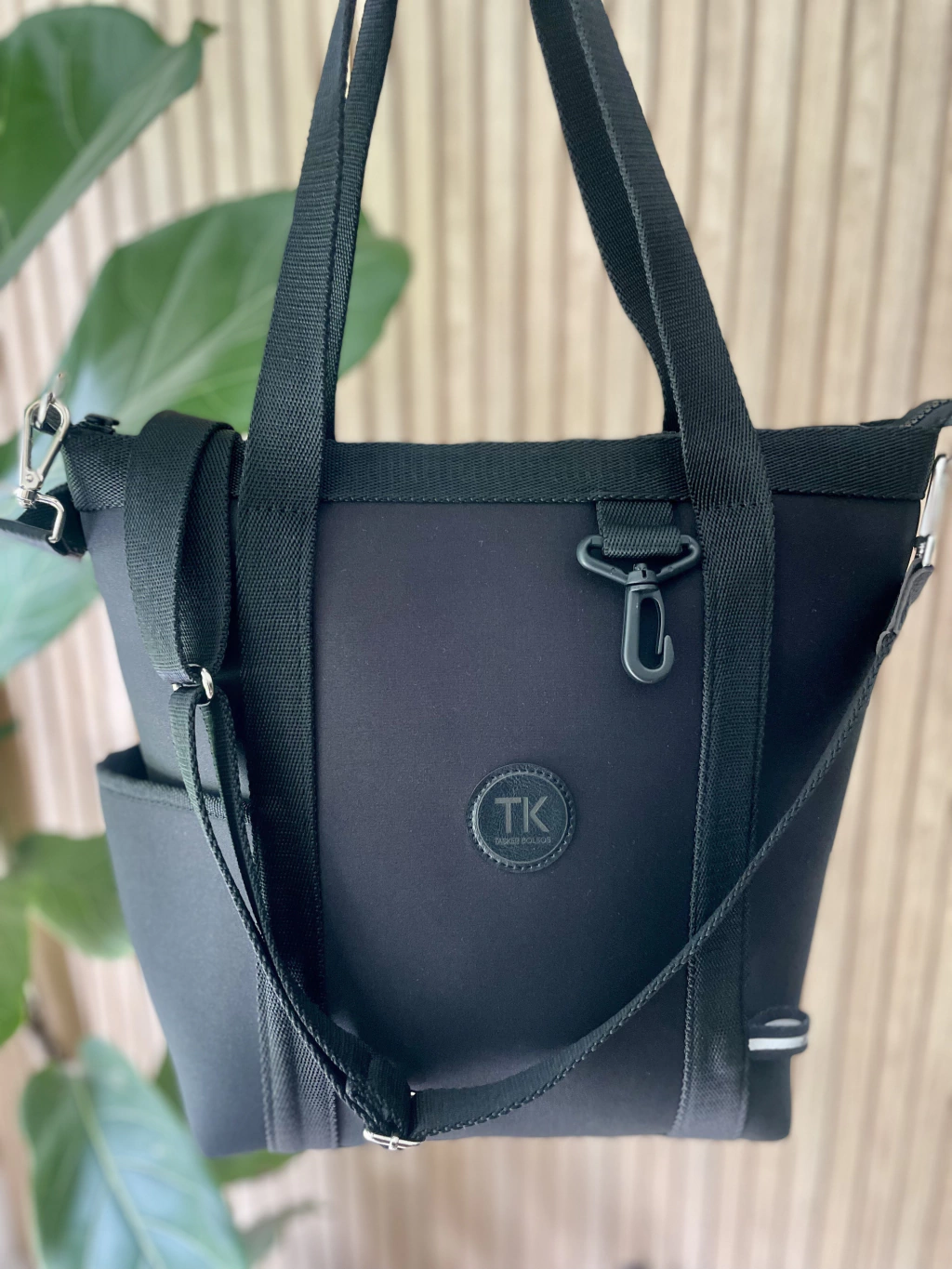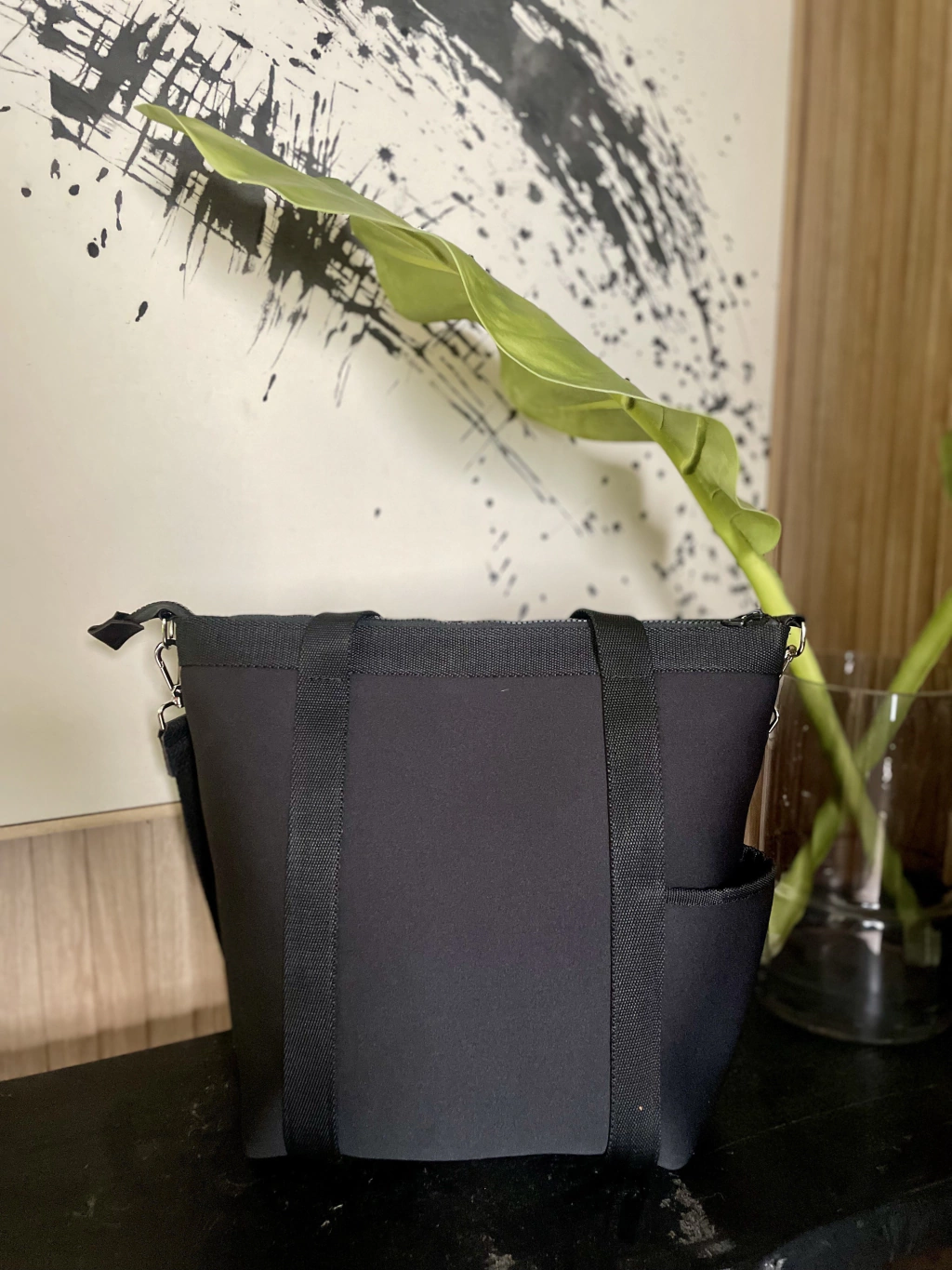 BOLSO DE NEOPRENE CON BASE DE CUERO, FORRADO EN SILVER, CIERRE DIENTE DE PERRO, CORREA CORTA DE HOMBRO Y CORREA LARGA REGULABLE CON MOSQUETONES PARA DESMONTAR, BOLSILLO EXTERNO PARA BOTELLA U OTROS ELEMENTOS.
