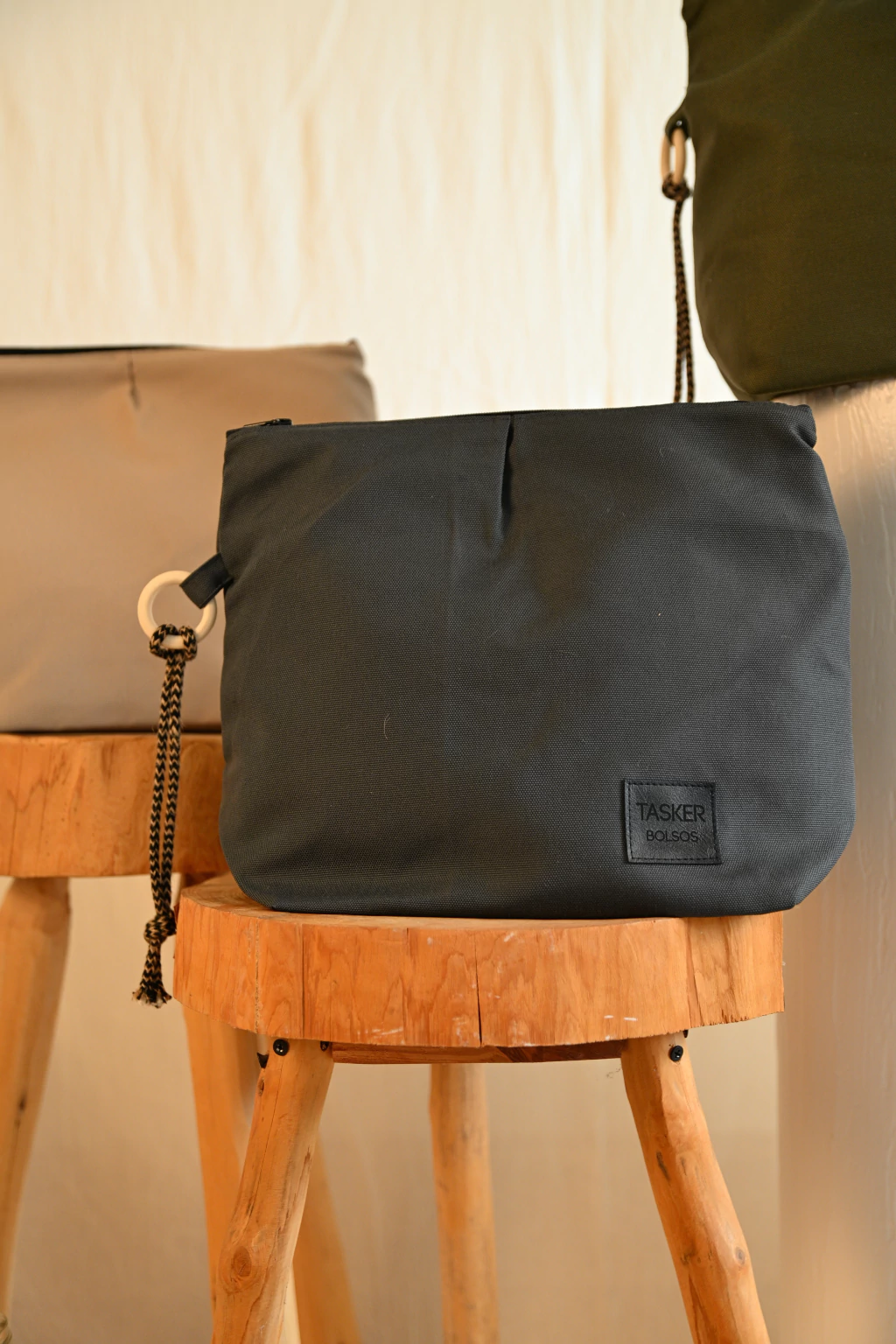 NECESER DE TELA ANTIDESGARRO, FORRADO EN TELA IMPERMEABLE, IDEAL PARA COSMETICOS. TIENE CIERRE DE PLASTICO REFORZADO, DETALLE DE ARGOLLA DE MADERA Y CORDON DE YUTE COMBINADO. ES MUY AMPLIO.